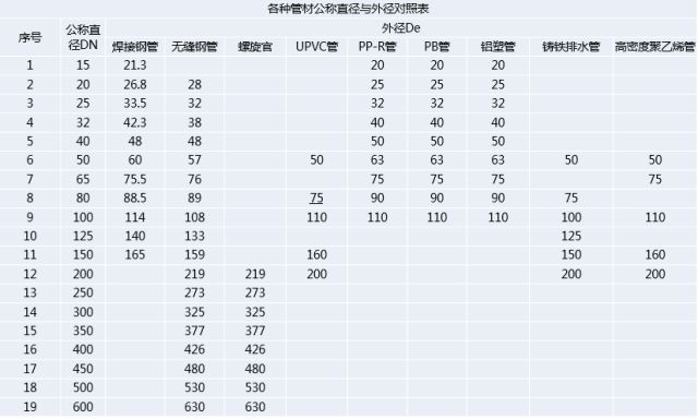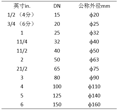 公称直径可用公制mm表示,也可用英制in表示。管路附件也用公称直径表示,意义同有缝管。它与英制单位的对应关系如下: